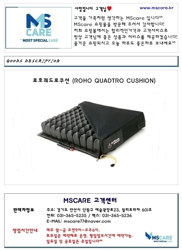미국 로호 프로덕트(ROHO PRODUCTS INC)사 의 로호 쿼드로 쿠션은 여러 개의 공기주머니 (AIR CELLS)들이 둔부를 개별적으로 받혀 주어 압력을 분산함으로써, 피부손상의 방지에 중요한 요소들인 하중 압력의 완화, 마찰의 최소화 및 혈액 순환의 원활성을 유지하게 하여 욕창 발생의 가능성을 최소화할 수 있도록 디자인된 경량의 공기쿠션입니다.