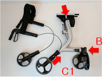 2. C1에 뒷바퀴 장착(브레이크선이 밖으로 나오게 장착.)