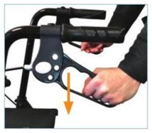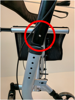 3. 위쪽에 손잡이 장착 (손잡이 높이조절 버튼이 바깥쪽으로 나오게 조립.)